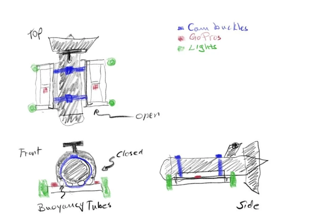 From the start, it was clear that such a system needed to be neutral and trimmed. Ideally, it would be suitable for long distance travel too. A first DPV nose mounted photogrammetry platform was developed with inspiration from systems designed by Holger Buss and Brian Bosveld; and assembled with help from Richard Larocque.